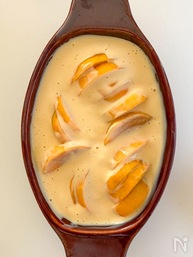 (3) 2を型に流し入れ、柿を並べて、180℃で30分ほど焼く。