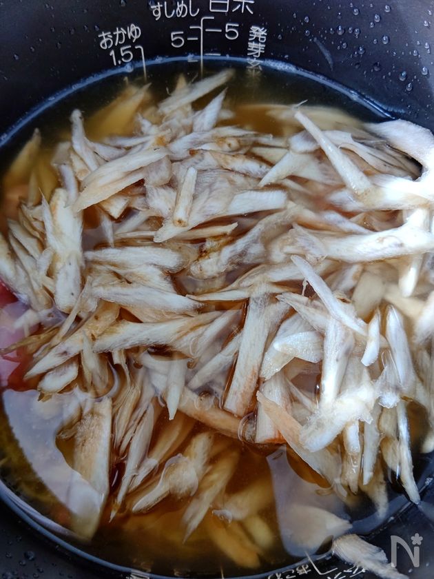 (2) 先ず、米に【A】を入れ、水を規定の分量入れる。鶏もも肉とごぼう、生姜を加えて炊き込み炊飯する。お好みでネギを添える。