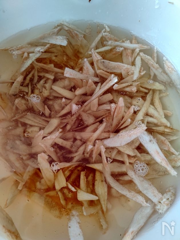 🔶ごぼうは長時間水につけてアク抜きすると栄養素が流れてしまうので3分ほどつけたらあげて下さい。