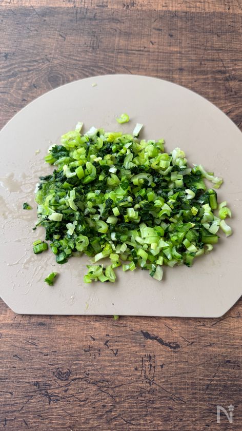 (2) 水気をしぼり、みじん切りにする。