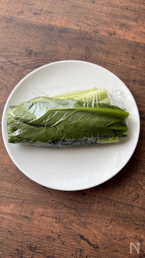 (1) 小松菜はよく洗い、半分に切って重ね、ラップで包む。耐熱さらに乗せ、600w1分加熱後冷水にとる。