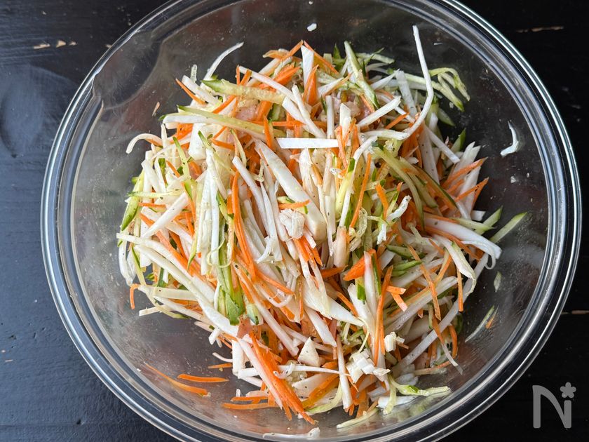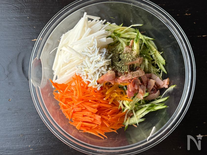 (2) ボウルにかぶ、にんじん、きゅうり、1のベーコン、【A】を入れる。