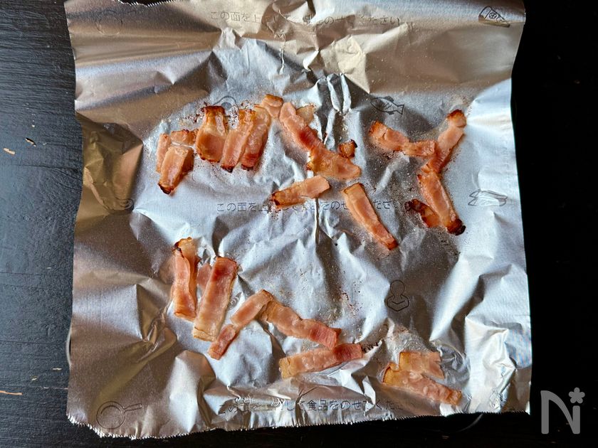 (1) 鉄板の上にアルミホイルをしき、ベーコンを並べる。
