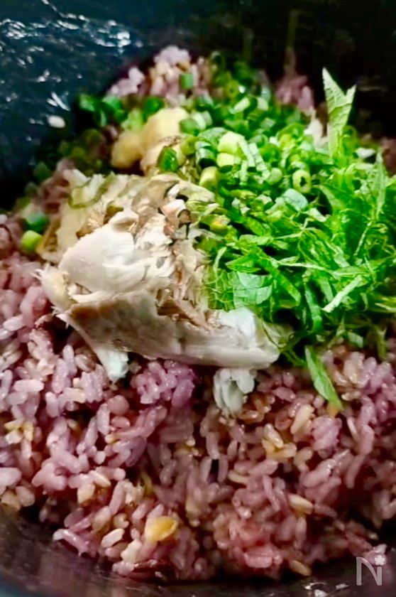 (1) 焼いた塩さばの皮と骨を取り除く。 温かいご飯に塩さば+【A】+細切りにした大葉+白いりごま+刻みねぎを加えて混ぜる。