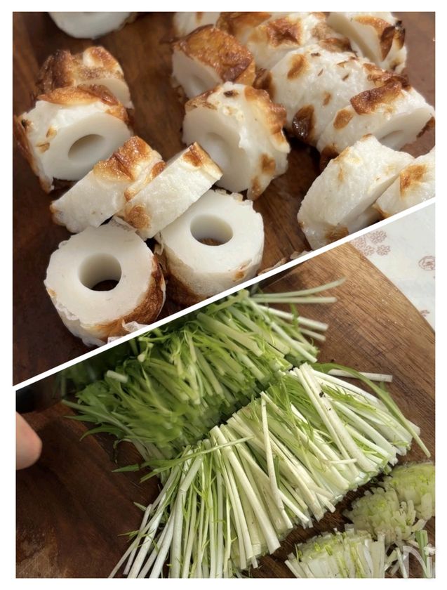 (1) 水菜は4等分のざく切り、ちくわは約1cm幅の輪切りにする。