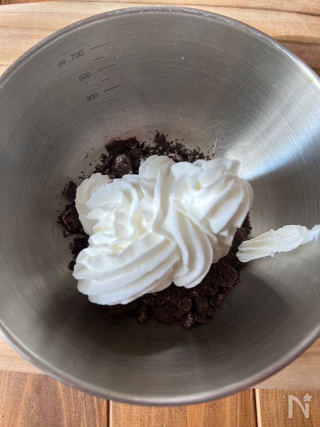 (4) ボウルにオレオと泡立て済みポイップをいれ、混ぜ合わせる。