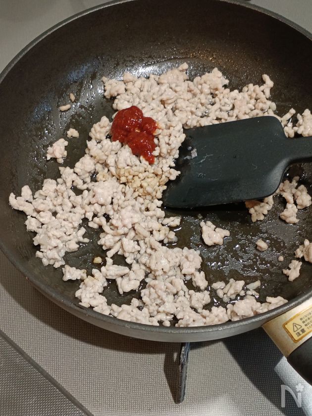 (3) 豚ひき肉にある程度火が通ったら、【A】を加えて、汁気がなくなるまで炒め合わせる。
