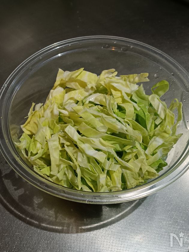 (1) キャベツは細切りにして、塩をまぶす。耐熱容器に入れて、ふんわりとラップをし、電子レンジ600Wで2分加熱する。