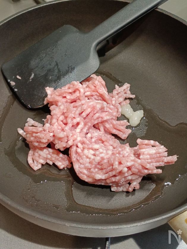 (2) フライパンに油、豚ひき肉、にんにくチューブを入れ、火にかける。