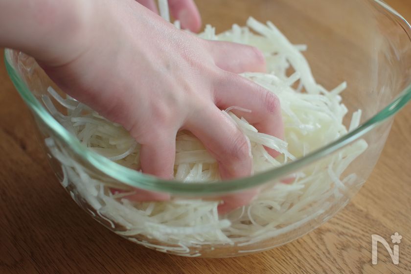 (2) 塩小さじ1/2(分量外)を加えて手でもみ込む。しんなりしたら流水で洗い、水気をしっかり絞る。
