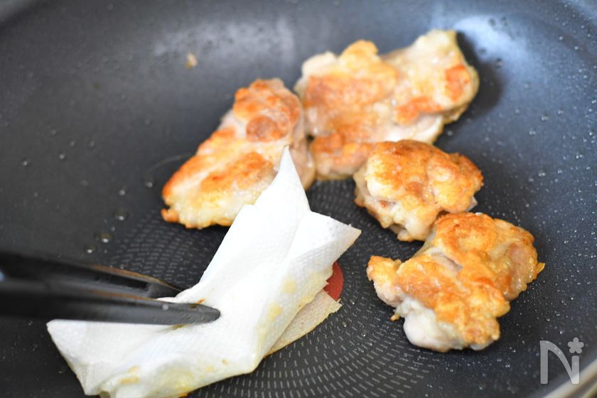 再び皮目を下にしてキッチンペーパーで油を取りながらカリっとなるまで焼く。