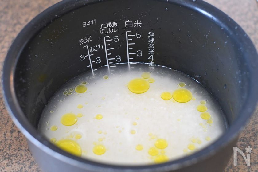 (6) 米を磨ぐ。通常の水分量を入れ、【C】を加えて炊飯器で炊く。炊き上がったら刻んだブラックオリーブ(種なし)を混ぜる。