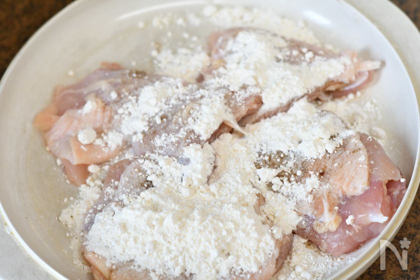 (2) 鶏もも肉を4等分にカットし、両面に【A】をする。