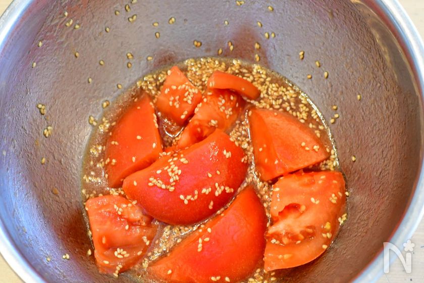 (1) トマトは大きめに乱切りし、ボウルに入れる。
