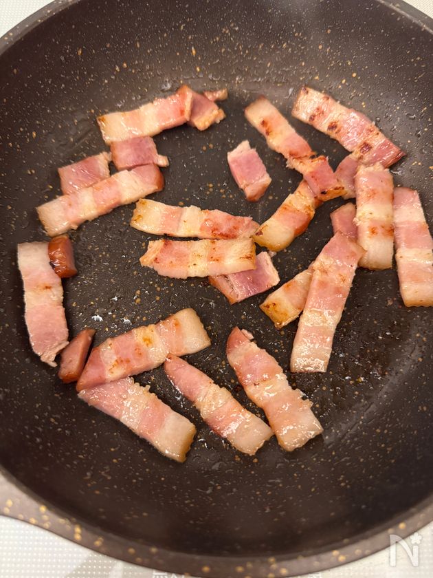 その間に、フライパンに、オリーブオイルをひき、ベーコンを炒める。