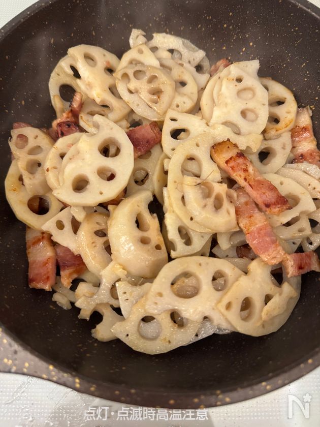 (2) れんこんを入れ、少し焼き色をつける。粗熱をとる。