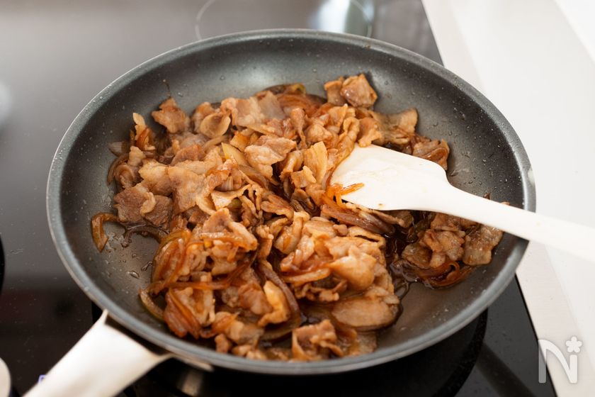 玉ねぎは薄切りにし、豚バラ肉薄切りは2~3㎝幅に切る。フライパンを中火で熱し、豚肉と玉ねぎを炒め、玉ねぎがしんなりしてきたら【A】を加えて汁気がほぼなくなるまでよく炒める。