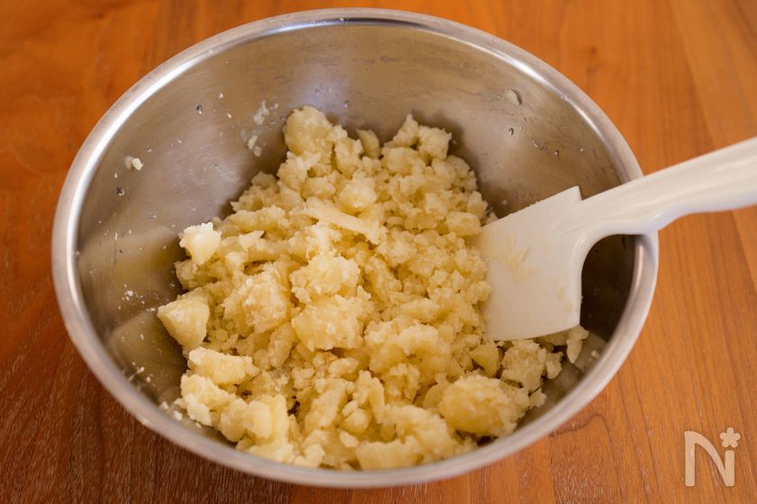 (1) じゃがいもは皮付きのままよく洗う。鍋にじゃがいもと浸るくらいの水を入れて火にかけ、やわらかくなるまで15~20分茹でる。取り出して温かいうちに皮をむき、ボウルに入れて潰す。塩で軽く下味をつける。