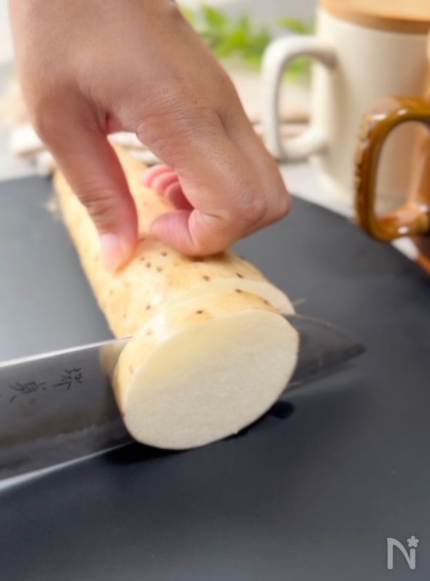 (1) 長芋はよく洗って、皮付きのまま1cmの厚さに切る。