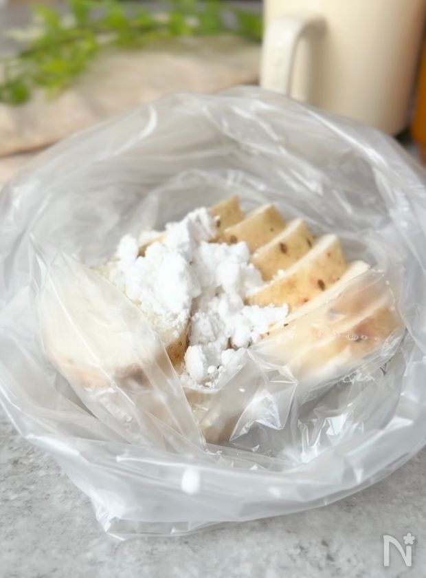 (2) ポリ袋に長芋を入れて、片栗粉をまぶす。