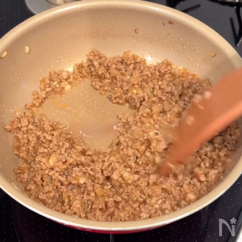 (1) フライパンに油を敷き、合い挽き肉と玉ねぎを入れて炒める。