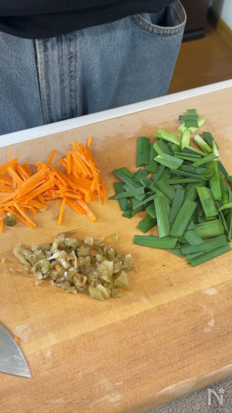 (1) 人参を細く切り、ニラを食べやすい大きさ、ザーサイを細かく切る。
