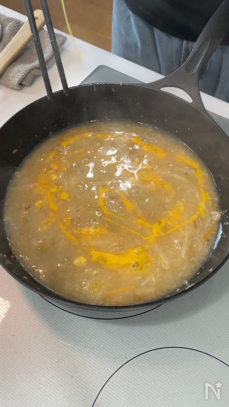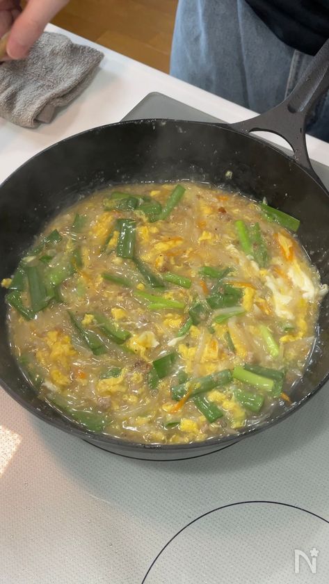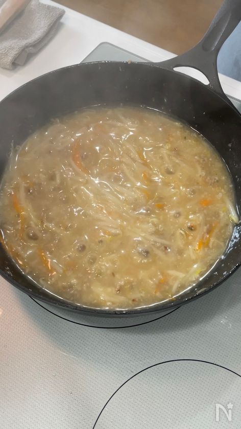 (4) もやしも加えてサッと炒めたら、【A】を加えて、とろみが出るまで加熱する。