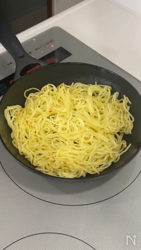 (7) 別のフライパンに焼きそば麺を入れてほぐしながら両面に焼き目をつける。皿に乗せて、⑥を掛けて完成。