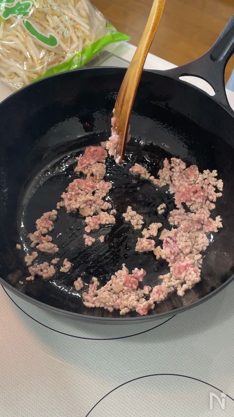 (2) 熱したフライパンにごま油引いて、豚ひき肉を入れ中火で炒める。