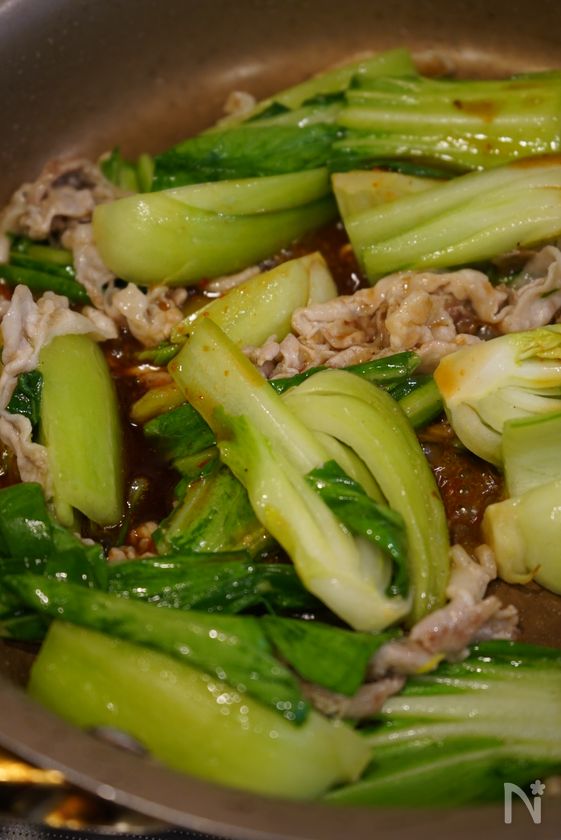 (1) フライパンにサラダ油、生姜を入れて熱し、香りが出たら豚バラ肉を入れて炒める。色が変わってきたら青梗菜の茎の部分を加えて炒める。