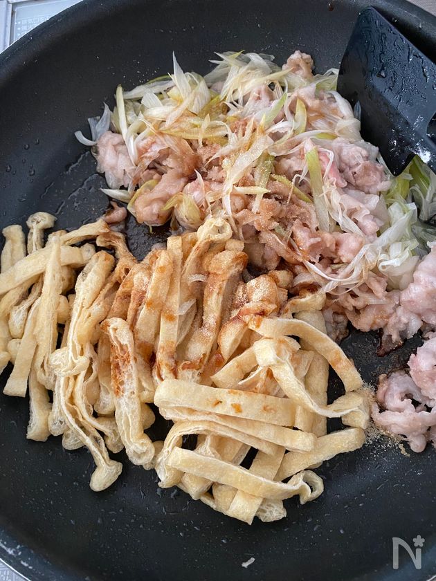(2) 豚肉と長ねぎを混ぜ合わせ、油揚げ・【B】を加えて中火で2分ほど炒める。