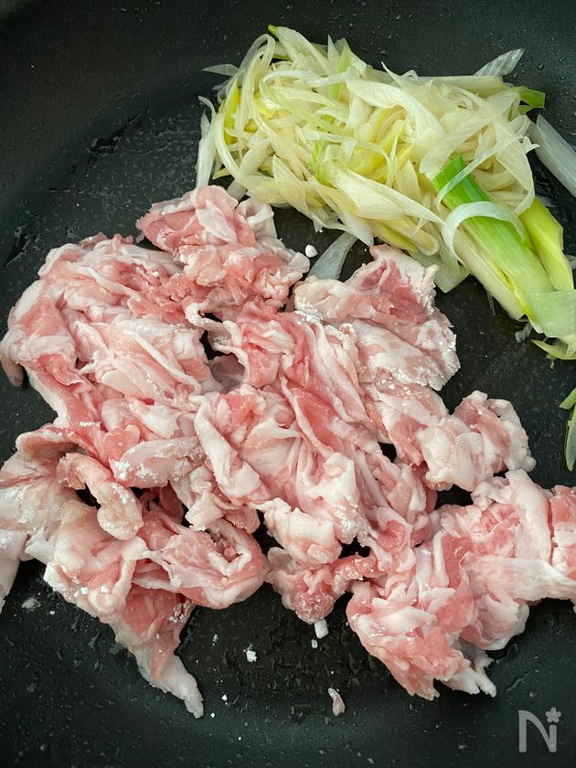 (1) ごま油をひいたフライパンを熱し、長ねぎを中火で2分炒めたらフライパンの端に寄せ、空いているところに豚肉を入れて中火で2分ほど炒める。(お肉に8割ほど火が通った状態)