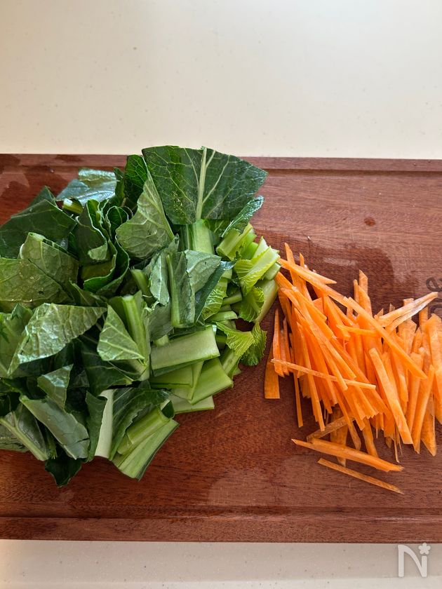 (1) 小松菜はざく切りに、にんじんは千切りにする。耐熱ボウルに入れてふんわりラップをし、600wの電子レンジで2分ほど加熱する。粗熱が取れたら水気を絞る。
