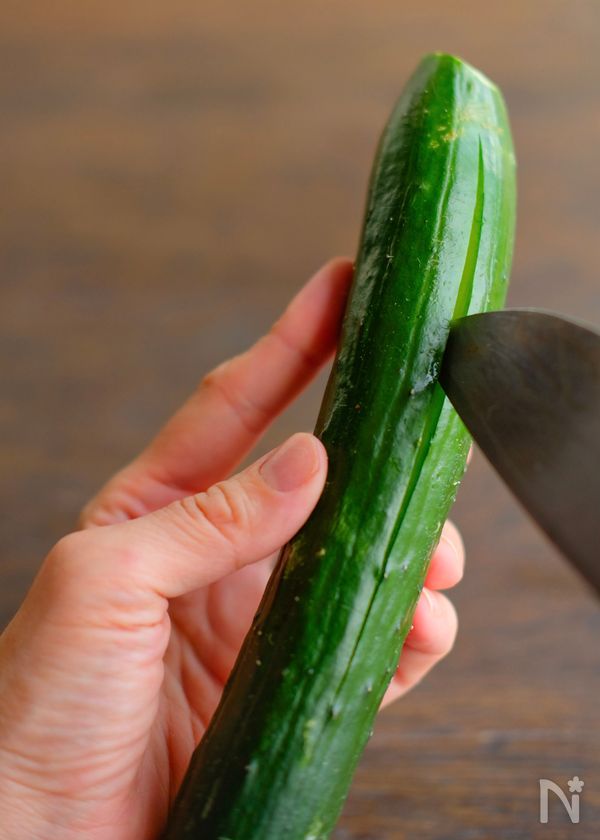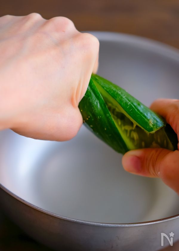 (1) きゅうりは両端のヘタを切り、麺棒やすりこぎなどで叩いてヒビを入れてから、手で割る。