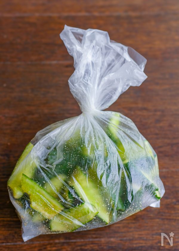 (3) ポリ袋に入れて【A】を揉み込み10分置き、ザルにあげて水気を切る。