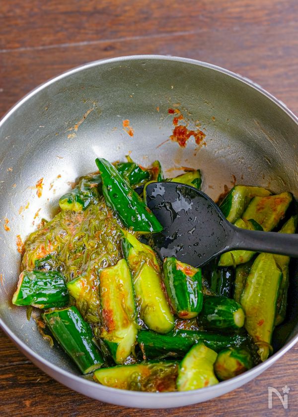 (5) めかぶ(味付け無し)、きゅうり、かつお節を加えて和えたら出来上がり!
