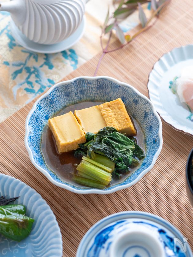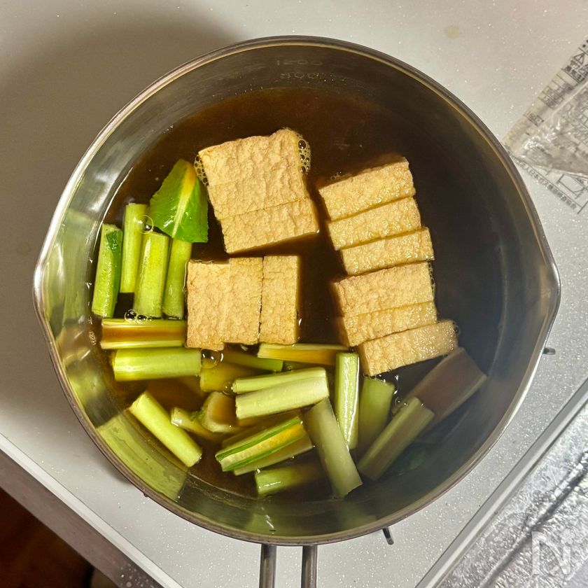 (2) 鍋に【A】を入れて火にかけ、煮立ったら厚揚げ、小松菜の茎を加え、弱めの中火で2分ほど煮る。