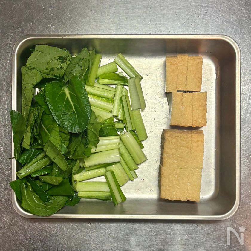 厚揚げはペーパータオルで油を拭き、縦半分に切ってから横1cm幅に切る。
