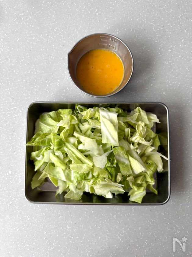 (1) キャベツは軸を切り取って斜め薄切りにし、葉はざく切りにする。卵は溶きほぐす。Cを合わせておく。