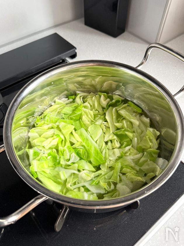 (2) 鍋に【A】とキャベツを入れて沸騰させ、中火で2分ほど煮る。