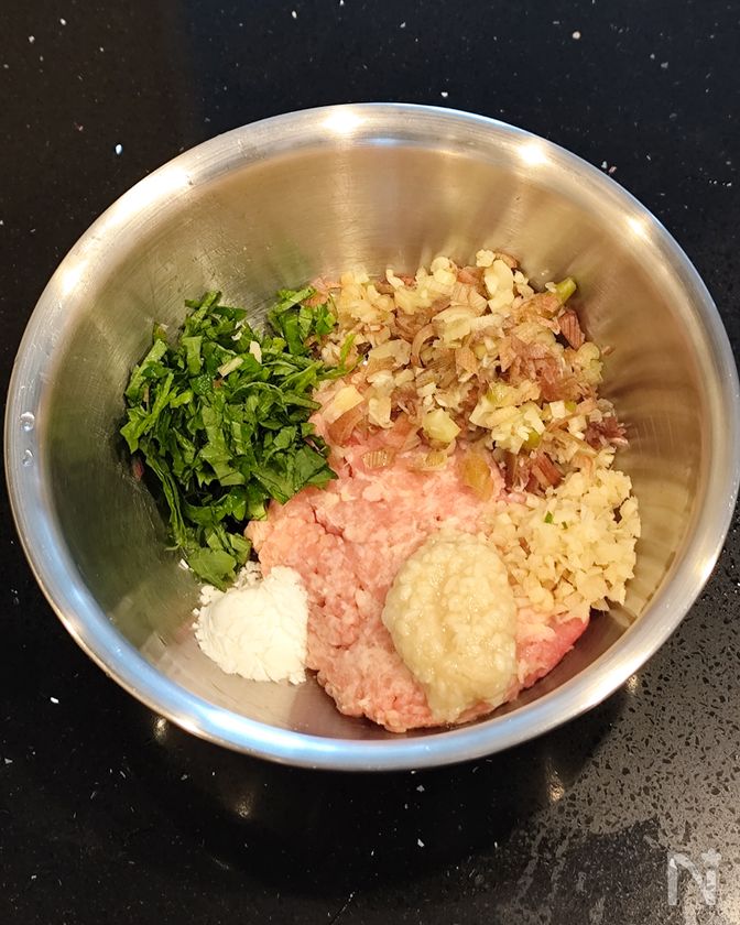 (2) 鶏ももひき肉と、みじん切りにした大葉、みょうが、生姜、塩麴大さじ1、片栗粉小さじ1を全て混ぜ合わせる。