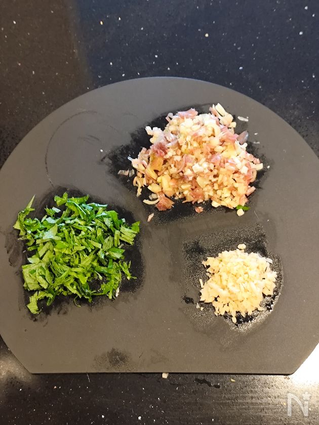 (1) 大葉、みょうが、しょうがをみじん切りにする。