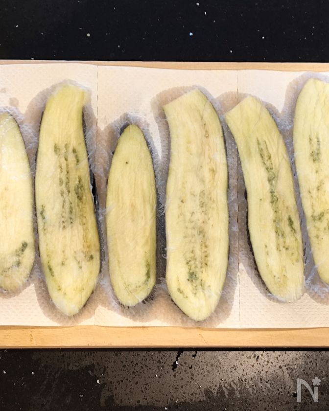 (3) なす全体が曲げられるくらい柔らかくなったら、キッチンペーパーで水分を拭きとる。