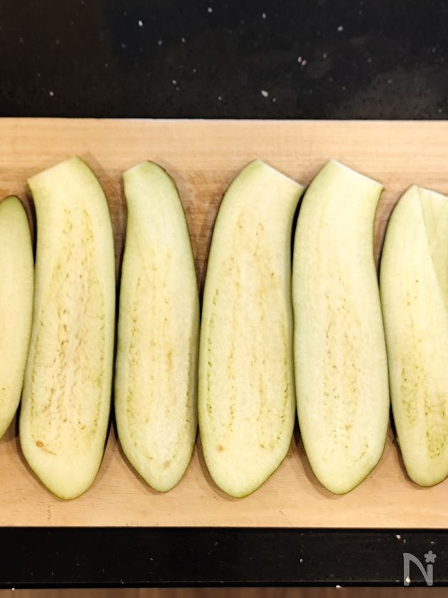 (下準備) なすを縦に薄切りにし(厚さ1cm程度)、塩小さじ1を振っておいておく。