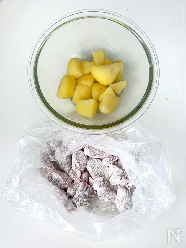 じゃがいもは、2〜3cm角の乱切りにして、耐熱ボウルに入れ、ふんわりラップをかけて、電子レンジ500Wで、6分加熱する。