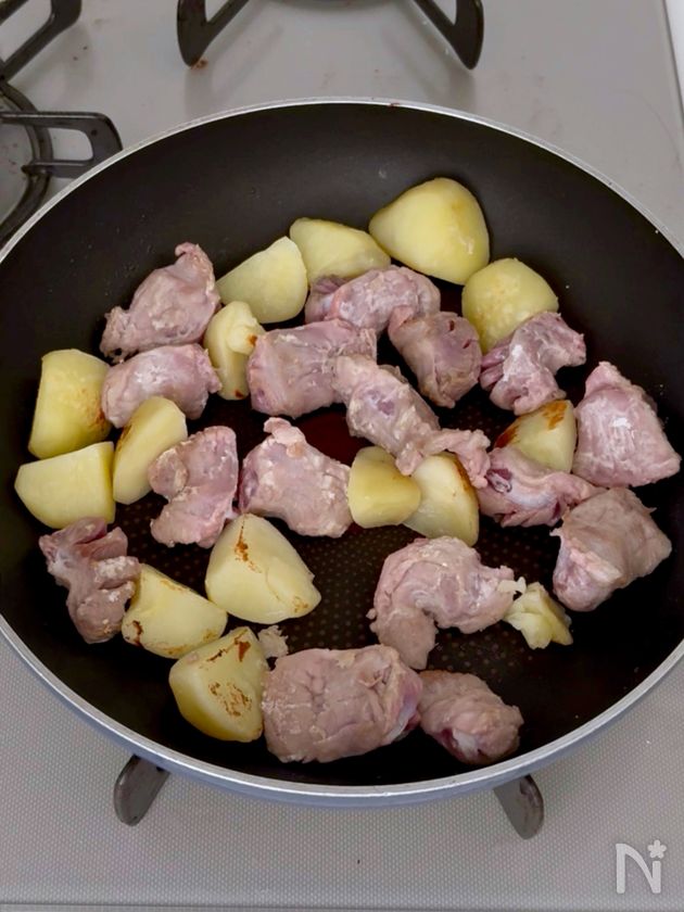 (2) フライパンにサラダ油をひき、砂肝を入れ、中火で5分ほどしっかりと焼いたら、じゃがいもを入れて、あまり動かさないようにしながら、焼き目をつける。