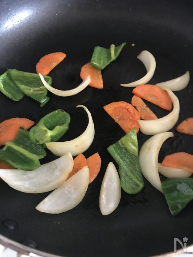 (1) 熱したフライパンに【A】を入れて炒めます。