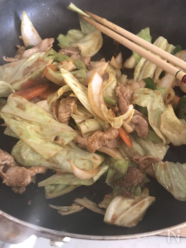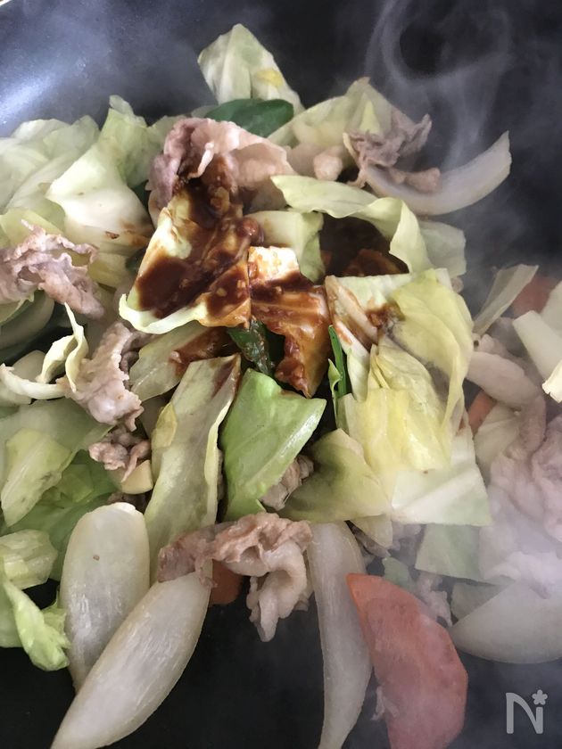 (2) 【B】を入れて炒めます。豚肉に火が通るまで。【C】を一気に入れてさっと炒めます。