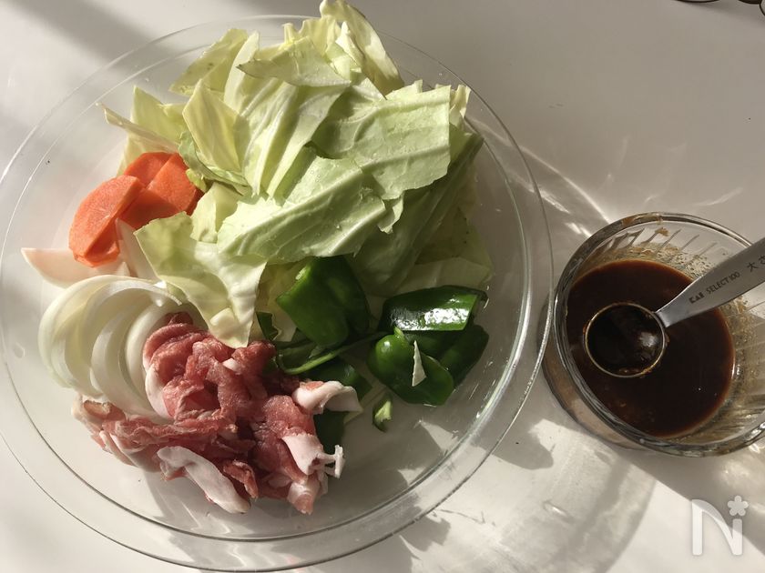 (下準備) 調味料は計量し、野菜や肉は食べやすい大きさに切っておきます。