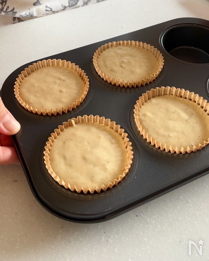 マフィン型に生地を入れすぎると焼いたときに溢れてしまうので、7割ぐらいを目安に入れてください!